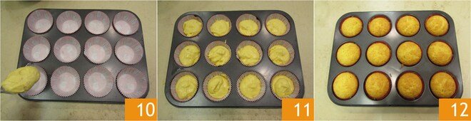 Tapissez un moule à muffins de 12 caissettes en papier, puis remplissez-les avec environ 50 g de pâte chacune à l'aide d'une cuillère 11 12. Avant d'enfourner, tapez plusieurs fois le moule sur le plan de travail, de manière à niveler soigneusement la surface et obtenir des cupcakes gonflés mais avec une surface plate. Faites cuire dans un four préchauffé à 180° pendant environ 25-30 minutes, puis procédez à la deuxième cuisson : avec ces doses, vous obtiendrez environ 24 cupcakes. Une fois cuits, laissez-les refroidir à température ambiante avant de les garnir 12.