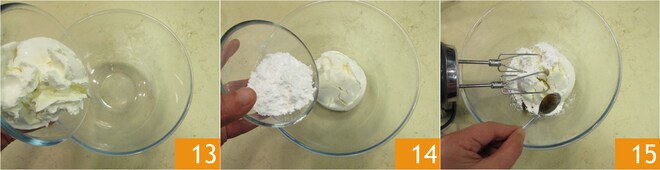 Maintenant, travaillez le mascarpone avec les fouets électriques 13 avec le sucre 14 et l'extrait de vanille 15.