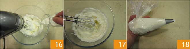 Versez la crème 16 jusqu'à obtenir une crème montée 17. Transférez la crème dans une poche à douille avec une douille étoile 18 et placez-la au réfrigérateur.