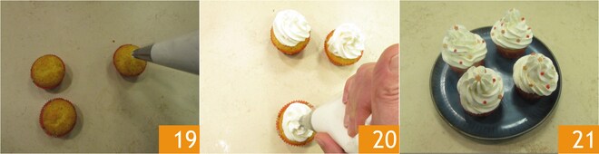 Reprenez les cupcakes maintenant froids 19 et garnissez-les avec le glaçage 20. Décorez avec des vermicelles colorés et servez vos cupcakes de Noël 21!