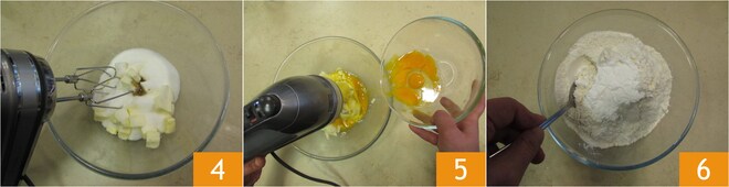 Actionnez les fouets à vitesse moyenne-élevée 4 et laissez le mélange monter légèrement. Après quelques minutes, ajoutez les œufs petit à petit 5, tout en continuant à travailler avec les fouets. Tamisez les poudres dans un bol 6.