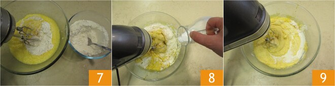 Dès que les œufs sont incorporés, versez les poudres petit à petit 7. Travaillez avec les fouets pour incorporer les poudres, puis versez le lait en filet 8. Mélangez jusqu'à obtenir un mélange homogène 9.