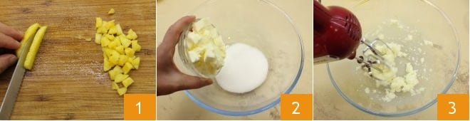 Pour réaliser les cupcakes pinacolada, épluchez l'ananas frais et coupez-en 170 gr en petits dés 1, placez le beurre mou et le sucre dans un bol 2, fouettez-les avec un batteur électrique pour obtenir une crème 3