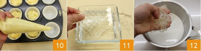Répartissez la pâte obtenue dans les 12 caissettes 10 en les remplissant à moitié, de sorte qu'à la cuisson, ils atteindront le bord des caissettes. Faites cuire dans un four statique préchauffé à 180° pendant 20 minutes (ou ventilé à 160° pendant 10-15 minutes). Pendant ce temps, préparez la crème : mettez la gélatine en feuilles dans un bol avec de l'eau froide pendant 10 minutes pour la ramollir 11, versez le lait de coco dans une casserole et chauffez-le à feu modéré, puis éteignez le feu et incorporez la gélatine égouttée et bien essorée 12,