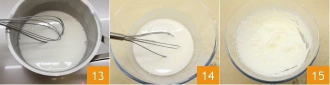 mélangez au fouet pour faire fondre la gélatine 13. Transférez le lait de coco dans un bol 14, couvrez avec un film plastique au contact et laissez reposer la crème au réfrigérateur pendant 1 heure. Une fois ce temps écoulé, fouettez la crème fraîche liquide avec le sucre glace 15
