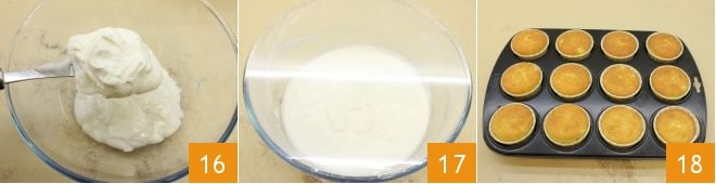 et incorporez-la au lait de coco 16, mélangez avec une spatule pour amalgamer le mélange, couvrez la crème avec un film plastique 17 et laissez à nouveau reposer au réfrigérateur pendant 30 minutes. Une fois le temps de repos écoulé, récupérez les cupcakes maintenant refroidis 18, démoulez-les du moule multiple en gardant les caissettes en papier.