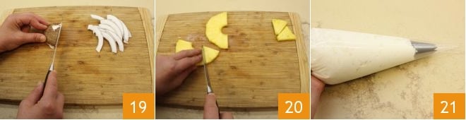 Réalisez les décorations : coupez la noix de coco en quartiers 19 et les tranches d'ananas en petits triangles 20. Transférez la crème de coco dans une poche à douille avec une douille étoilée 21