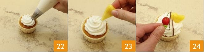 et pressez une rosette sur chaque cupcake 22, garnissez de morceaux d'ananas 23, d'une cerise égouttée du liquide de conservation, de petits morceaux de noix de coco (ou de noix de coco déshydratée) et de feuilles de menthe 24. Vos cupcakes pinacolada sont prêts !