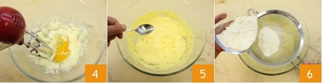 ajoutez ensuite les œufs 4 et lorsqu'ils seront bien incorporés à la pâte, versez l'arôme de rhum 5, mélangez avec une spatule et ajoutez la farine tamisée 6 et la levure.