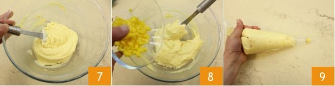 Mélangez jusqu'à ce que les poudres soient bien amalgamées 7 et enfin ajoutez les morceaux d'ananas frais 8. Transférez la pâte dans une poche à douille sans embout 9, puis placez des caissettes en papier dans un moule à 12 cupcakes.
