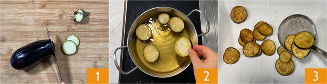 Pour préparer le cuzzetiello à la parmigiana, commencez par couper les aubergines en tranches d'une épaisseur de 1 à 2 cm 1. Épongez-les bien et faites-les frire dans de l'huile d'arachide 2 à environ 170°C, pendant 2-3 minutes. Faites-les frire par petites quantités pour ne pas trop faire baisser la température de l'huile. Transférez-les ensuite sur du papier absorbant 3 pour éliminer l'excès d'huile, ajoutez une pincée de sel et réservez.