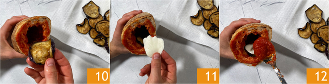 Continuez avec une tranche d'aubergine 10, une tranche de mozzarella 11 et un peu plus de sauce 12.
