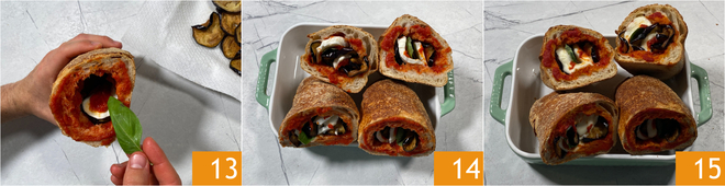Complétez la première couche avec une feuille de basilic 13. Faites deux autres couches en suivant le même ordre et en fermant les cuzzetielli avec une tranche d'aubergine 14 et disposez-les dans un plat à gratin. Faites cuire au four statique à 200°C pendant 5 minutes. Votre cuzzetiello à la parmigiana est prêt à être dégusté 15 !