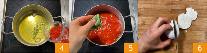 Dans une casserole, versez l'huile d'olive, ajoutez les tiges de basilic, l'ail coupé en deux et faites revenir quelques minutes. Ajoutez la purée de tomates 4, le basilic 5, rectifiez l'assaisonnement avec du sel et laissez cuire, à feu moyen, pendant environ 30-40 minutes. À la fin de la cuisson, retirez l'ail et les tiges de basilic. Entre-temps, coupez la mozzarella en tranches 6.