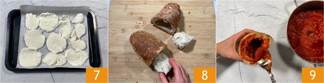 Laissez-la égoutter sur du papier absorbant 7. Coupez les extrémités des pains pour obtenir 4 morceaux d'environ 180 g chacun, puis videz-les de leur mie 8. À ce stade, vous pouvez remplir les cuzzetielli en commençant par la sauce 9.