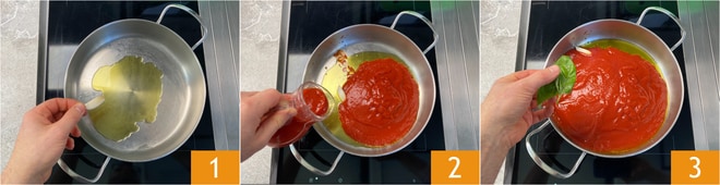 Pour préparer le cuzzetiello avec boulettes, commencez par mettre un filet d'huile et l'ail dans une casserole 1. Faites revenir, à feu moyen, pendant quelques minutes, puis ajoutez la purée de tomates 2, quelques feuilles de basilic 3 et l'eau. Ajustez le sel et le poivre, baissez le feu et laissez cuire pendant au moins 30 minutes.