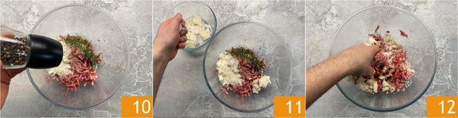 Ajustez le sel et le poivre 10. Enfin, incorporez la mie bien essorée 11. Pétrissez 12 jusqu'à obtenir un mélange homogène.