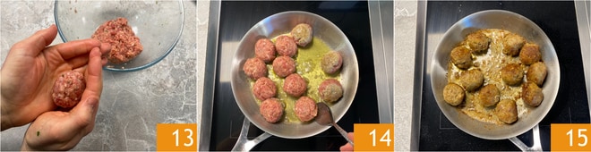 Prélevez un peu de pâte et roulez-la entre vos mains pour former de grosses boulettes 13. Répétez les mêmes étapes jusqu'à épuisement de la pâte. Dans une poêle antiadhésive, chauffez l'huile, lorsqu'elle est bien chaude, ajoutez les boulettes 14 et faites-les cuire de tous les côtés à feu moyen pendant environ 6-7 minutes, jusqu'à ce qu'elles soient dorées 15.