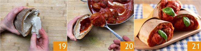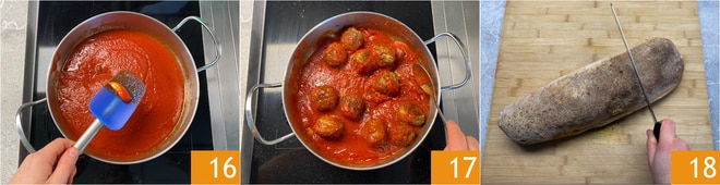 Éliminez l'ail 16. Transférez les boulettes dans la sauce et laissez-les s'imprégner pendant 1-2 minutes à feu moyen-doux 17. Coupez les extrémités des pains 18 pour obtenir 4 pièces d'environ 150 g chacune.