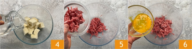 En attendant, préparez les boulettes. Dans un bol, mettez la mie de pain à tremper 4. Dans un autre bol, mettez le bœuf haché, celui de porc 5 et ajoutez l'œuf 6.