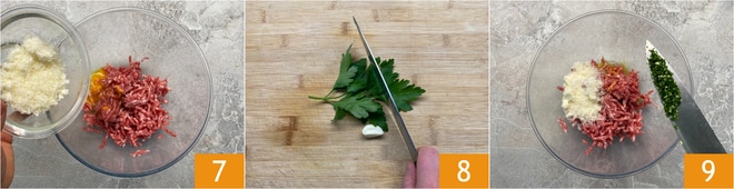 Ajoutez le parmesan râpé 7. Hachez le persil et l'ail au couteau 8 et ajoutez-les dans le bol 9.
