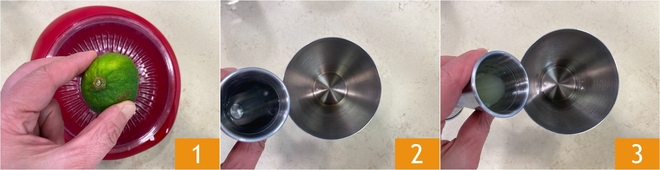 Pour préparer le daiquiri, commencez par presser le jus d'un citron vert, puis filtrez-le 1. Versez dans le verre du shaker le rhum blanc 2 et juste après le jus de citron vert filtré 3.