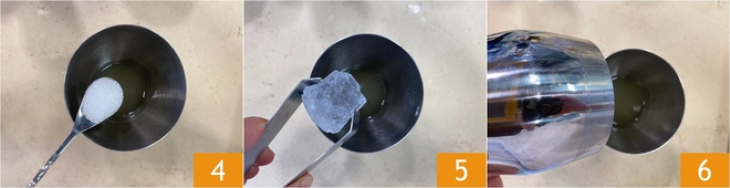Ajoutez le sucre blanc très fin et mélangez pour le dissoudre 4. Maintenant, ajoutez la glace 5 et fermez le récipient du shaker 6.