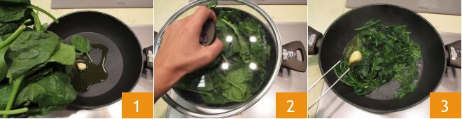 Pour réaliser le danube rapide de Noël, commencez par vous occuper des épinards : lavez les feuilles, puis faites chauffer un filet d'huile avec l'ail dans une poêle et ajoutez les épinards 1. Couvrez avec un couvercle 2 et faites-les ramollir à feu vif pendant environ 5 minutes, puis retirez l'ail et éteignez le feu 3.