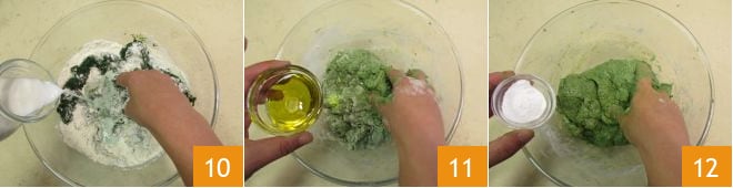 Pour finir, incorporez le sel 13 et terminez de pétrir sur un plan de travail 14. Formez une pâte homogène 15.