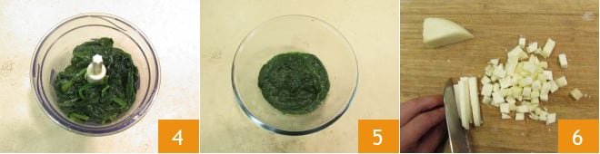 Transférez les épinards cuits dans le bol du mixeur 4 et mixez-les jusqu'à obtenir un mélange homogène et bien haché 5. Coupez le fromage en petits dés 6.