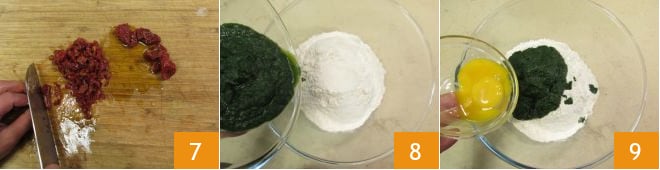 Hachez les tomates séchées égouttées de leur huile de conservation 7. Maintenant, versez la farine dans un grand bol, ajoutez la purée d'épinards 8 et le jaune d'œuf 9.