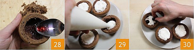 Une fois creusées et obtenues des petites coupoles creuses, passez au remplissage des délices : imbibez légèrement la base avec une cuillère à soupe de sirop de griottes 28 puis transférez la crème au yaourt dans une poche à douille sans embout et remplissez les délices seulement à moitié 29. Insérez à l'intérieur de chaque délice, en les poussant avec les doigts dans la crème, 4 griottes disposées en croix 30 et
