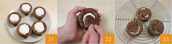 recouvrez l'autre moitié avec la crème 31. Enfin, couvrez la base avec le petit cercle de pâte mis de côté 32 et placez les délices prêtes sur une grille 33.