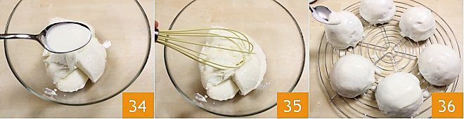 Allongez la crème restante avec une paire de cuillères à soupe de crème liquide ou de lait froid, 34 et détendez-la avec un fouet 35. Retournez les délices et recouvrez-les avec la crème fluidifiée 36, en la laissant couler sur la surface des sphères.