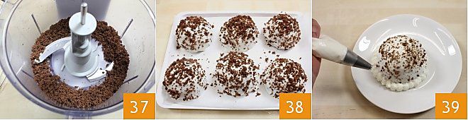 Mettez les miettes restantes de l'incision des délices dans un mixeur et réduisez-les presque en poudre 37. Répandez les miettes sur la surface des délices, avant que la crème ne se solidifie 38. Terminez les délices forêt noire avec la décoration : transférez la crème restante (ou si vous préférez de la crème fouettée), qui entre-temps se sera à nouveau raffermie grâce à la présence de la gélatine, dans une poche à douille avec embout étoile et décorez les délices, posées sur un plat de service avec de petites touffes à la base 39 et