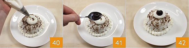 une grosse touffe sur le dessus 40, sur laquelle vous placerez, comme touche finale, une griotte au sirop 41. Voici vos délices forêt noire au Nesquik 42 prêtes à être dégustées !