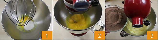Pour préparer les délices forêt noire au Nesquik, réalisez d'abord une génoise au Nesquik. Montez les jaunes d'œufs à température ambiante avec la moitié de la quantité totale de sucre, environ 65 g 1, avec le fouet d'un robot pâtissier ou avec un batteur électrique 2. Quand le mélange sera clair, gonflé et mousseux, cela prendra environ 7-8 minutes, ajoutez le Nesquik 3 et continuez à mélanger jusqu'à obtenir un beau mélange homogène.