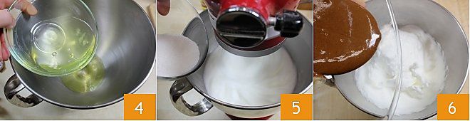 Dans un autre bol, montez les blancs d'œufs à température ambiante 4, avec le fouet d'un robot pâtissier ou un batteur électrique, et quand ils commenceront à devenir blancs, ajoutez le reste de sucre petit à petit 5 ; continuez de monter jusqu'à ce qu'ils aient atteint une consistance ferme et stable. Ajoutez ensuite le mélange de jaunes, sucre et Nesquik 6 et