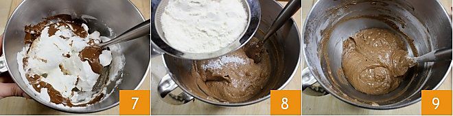 incorporez-le délicatement, en mélangeant avec une spatule de bas en haut, pour incorporer de l'air et de manière à ne pas casser les blancs 7. Ajoutez la farine tamisée 8 et mélangez-la bien au mélange 9.