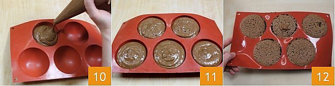 Transférez la pâte dans une poche à douille sans embout et pressez-la dans les moules appropriés, ou moule en silicone en demi-sphère de 7-8 cm de diamètre, en vous arrêtant à un doigt du bord (10-11). Enfournez les délices à 180° pour 25-30 minutes dans un four statique déjà chaud (si four ventilé 160° pour 20-25 minutes). Vérifiez la cuisson en faisant le test du cure-dent. Après les 30 minutes, sortez les délices du four 12, laissez-les tiédir puis démoulez-les et laissez-les refroidir sur une grille.