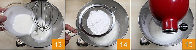 Passez maintenant à la préparation de la crème au yaourt : dans le bol d'un robot pâtissier (ou dans un bol avec un batteur électrique) versez la crème bien froide, en gardant de côté deux cuillères à soupe qui vous serviront à dissoudre la gélatine. Semi-montez la crème 13 (voir ici l'École de Cuisine : comment monter la crème), ajoutez le sucre glace tamisé une cuillère à la fois 14 et continuez à travailler avec le fouet 15,
