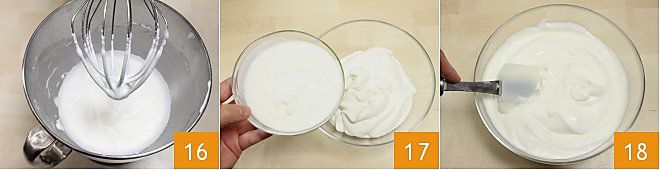 jusqu'à ce qu'elle soit bien montée 16. Transférez la crème à base de crème dans un bol et ajoutez-y le yaourt blanc non sucré 17 ; mélangez les deux ingrédients en remuant avec une spatule de bas en haut pour ne pas casser le mélange 18.