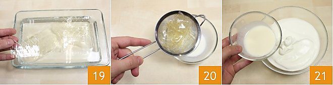 Mettez la gélatine à tremper pendant environ 10 minutes dans de l'eau froide 19, puis essorez-la bien, avec les mains ou avec une passoire, et faites-la fondre dans les deux cuillères à soupe de crème que vous avez mises de côté et que vous aurez fait tiédir 20. Ajoutez le mélange de crème et gélatine à la crème 21, en faisant attention à ce qu'il ne soit pas trop chaud, sinon il fera des grumeaux, et