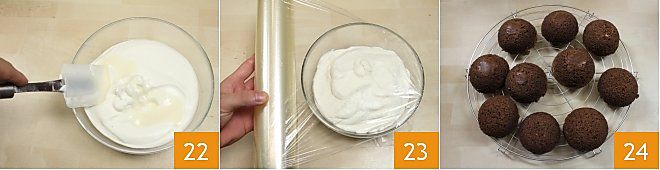amalgamer le tout avec la spatule 22 puis couvrez le bol avec du film plastique et mettez la crème au yaourt à raffermir au réfrigérateur pendant au moins 2-3 heures 23. Continuez avec le dessert : reprenez les délices démoulées, déjà froides 24 et