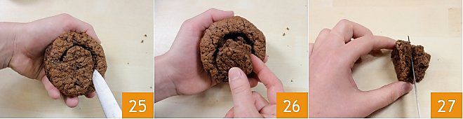 incisez-les à la base pour éliminer la partie centrale. En utilisant un petit couteau, marquez une trace circulaire en laissant un doigt du bord 25. Veillez à garder le cercle intact, car après vous devrez refermer les délices avec 26. Éliminez la partie excédentaire du cercle 27 et creusez les délices afin d'obtenir une cavité que vous allez ensuite remplir. Gardez de côté toutes les miettes ou morceaux de délices en excès.