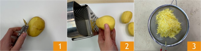 Pour préparer les deruny, épluchez les pommes de terre 1, puis râpez-les 2 et égouttez-les dans une passoire 3 en les pressant avec une cuillère pour éliminer l'excès d'eau végétale.