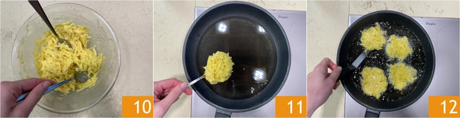 Prélevez une cuillère de pâte 10, puis plongez-la dans l'huile chaude et aplatissez légèrement la surface avec le dos de la cuillère 11, faites frire d'un côté jusqu'à ce qu'elle soit dorée 12.