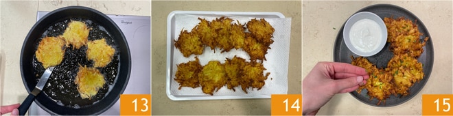 Retournez-les et poursuivez la friture de l'autre côté, toujours jusqu'à ce qu'elles soient dorées, cela prendra quelques minutes 13. Égouttez les galettes sur un plateau recouvert de papier absorbant 14 et servez immédiatement les deruny, saupoudrés de ciboulette hachée et accompagnés de crème aigre 15.
