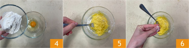 Dans un bol, cassez l'œuf et ajoutez la farine 4, mélangez avec une fourchette pour obtenir une pâte homogène 5, puis salez 6.