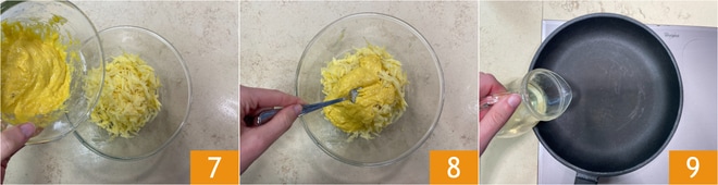 Ajoutez la pâte obtenue aux pommes de terre râpées 7. Mélangez à nouveau pour amalgamer 8. Chauffez bien une poêle puis versez un doigt d'huile de graines 9.